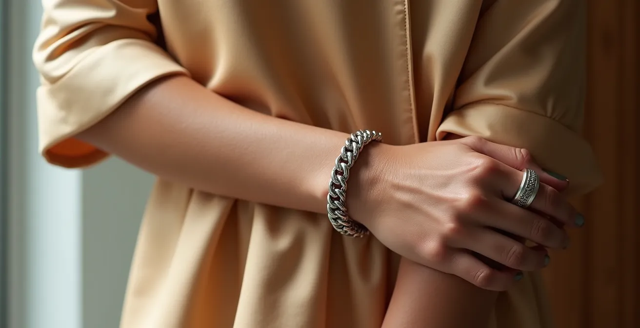Die Faszination liegt im Kontrast: das fließende, fast schwerelose Gefühl einer Seidenbluse auf der Haut, getroffen vom kühlen, unnachgiebigen Gewicht eines groben Gliederarmbands. Es ist ein modisches Statement, das Stärke und Zartheit vereint. Viele modebewusste Frauen träumen davon, diesen Look zu meistern, zögern aber aus Angst, die feine Linie zwischen „gewolltem Stilbruch“ und „modischem Unfall“ zu überschreiten. Die üblichen Ratschläge wie „Sei einfach mutig!“ oder „Mix and Match ist alles!“ helfen dabei wenig. Sie lassen die wichtigste Frage unbeantwortet: Wie genau funktioniert ein gelungener Kontrast?