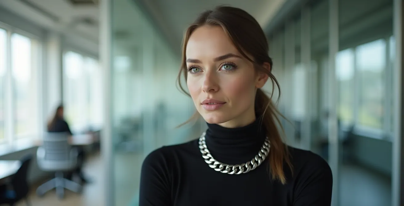 - Das Fundament ist entscheidend: Eine Statement-Kette wirkt am professionellsten auf einer ruhigen, hochgeschlossenen „Leinwand“ wie einem Rollkragenpullover.