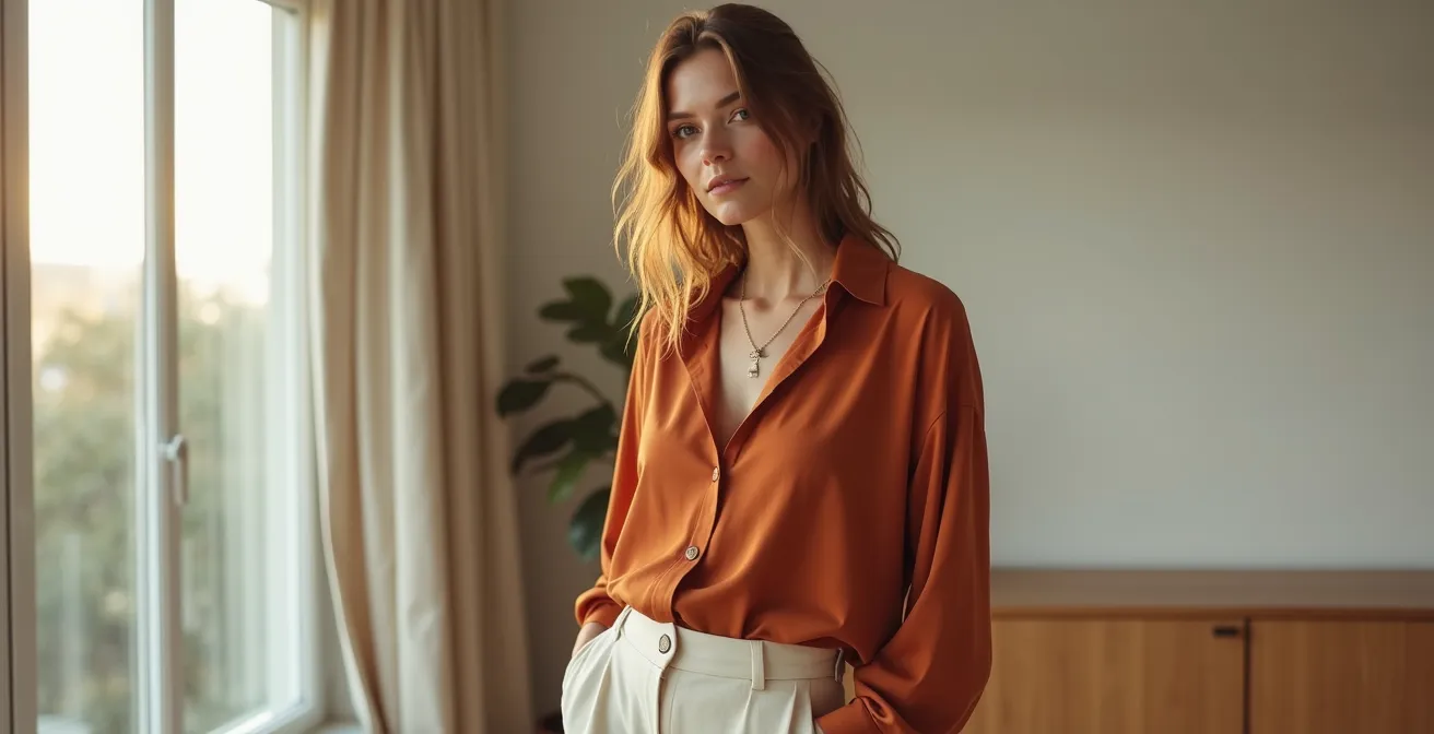 Die Kombination von Terrakotta und Creme ist hierfür ein Paradebeispiel. Terrakotta bringt eine erdige Wärme und Tiefe, während Creme für Helligkeit, Frische und eine edle Zurückhaltung sorgt. Zusammen erzeugen sie einen Look, der gleichzeitig entspannt und luxuriös wirkt. Stellen Sie sich eine weite Leinenhose in Terrakotta vor, kombiniert mit einer schlichten Seidenbluse in Creme. Der Look ist minimalistisch, aber durch die Qualität der Materialien und die durchdachte Farbwahl ausdrucksstark. Es geht darum, durch tonale Harmonie eine visuelle Ruhe zu erzeugen, die den Träger in den Mittelpunkt stellt, nicht das Outfit.